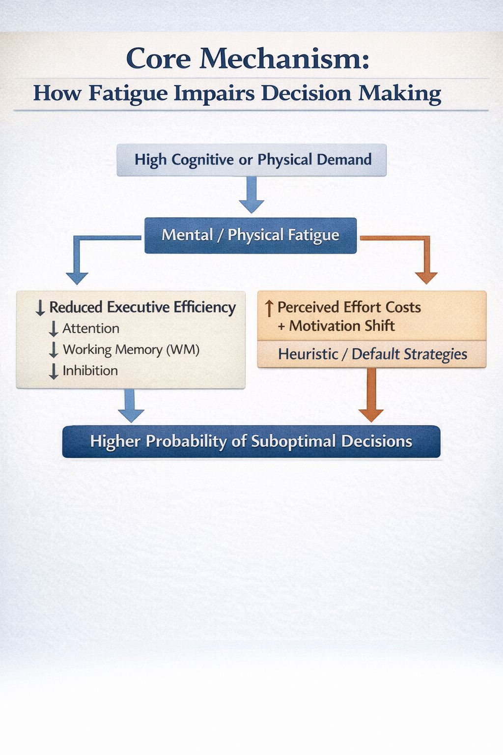 Meta-analytic research shows that sleep loss produces large impairments in attention and moderate impairments in inhibitory control, both of which are central to decision-making under complexity (Lim & Dinges, 2010; Choong et al., 2025).